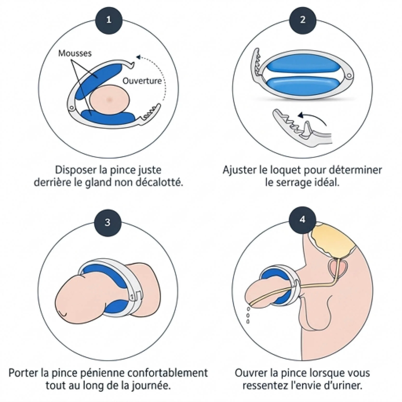• Après chaque miction, repositionnez légèrement la pince, un peu plus haut ou plus bas que l’emplacement précédent. Ce petit ajustement permet de répartir la pression et d’éviter toute irritation cutanée due au port prolongé.